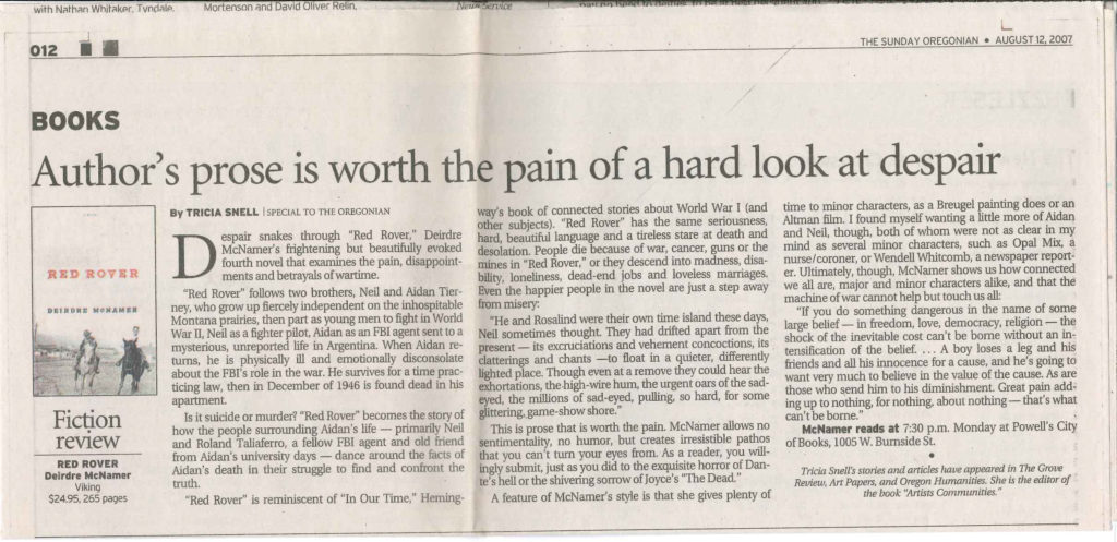 Review of RED ROVER, novel by Deirdre McNamer The Oregonian, Aug. 12, 2007. Click on image to enlarge it. review-deirdremcnamer Share this:FacebookTwitterLinkedInEmail Share this:FacebookTwitterLinkedInEmail Share this:FacebookTwitterLinkedInEmail