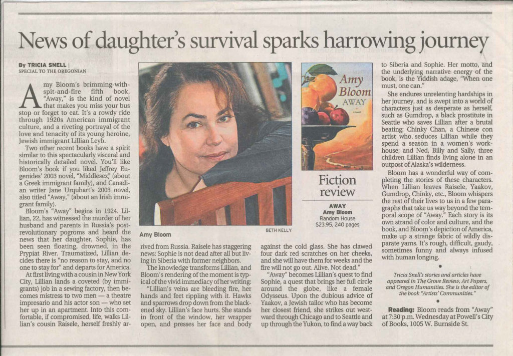 Review of AWAY, novel by Amy Bloom. The Oregonian, Sept. 23, 2007. Click on image to enlarge it. review-amybloom Share this:FacebookTwitterLinkedInEmail Share this:FacebookTwitterLinkedInEmail Share this:FacebookTwitterLinkedInEmail