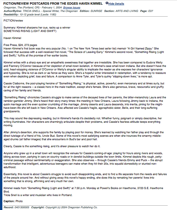 Review of SOMETHING RISING (LIGHT AND SWIFT), Novel by Haven Kimmel The Oregonian, Feb. 1, 2004. Review of Kimmel-Something Rising Share this:FacebookTwitterLinkedInEmail Share this:FacebookTwitterLinkedInEmail Share this:FacebookTwitterLinkedInEmail